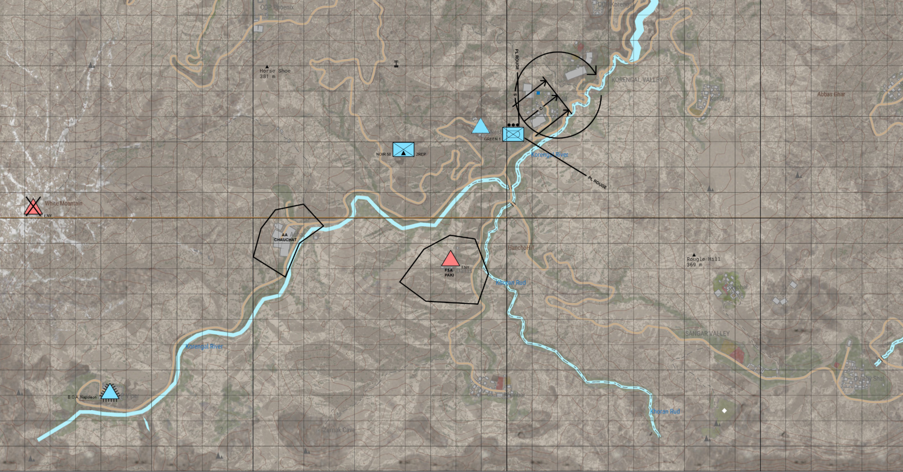 GREEN 1-0 (VBCI): Establish position at the Junction covering Hansho Hill and the Koran Rud river lines.