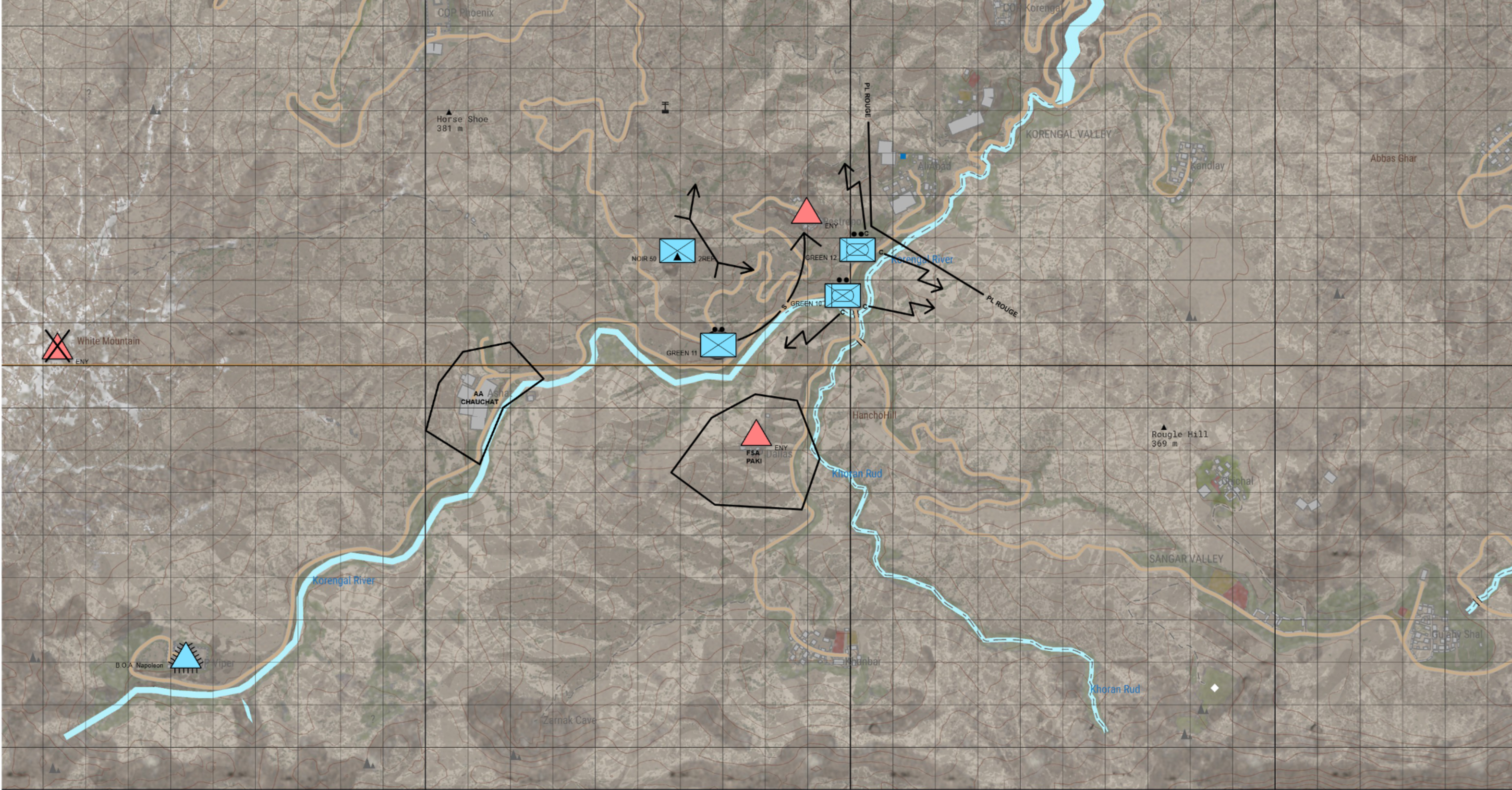 GREEN 1-2 (VBCI): Establish position at the Junction covering Ali Abad and the Korangal Valley approach.
