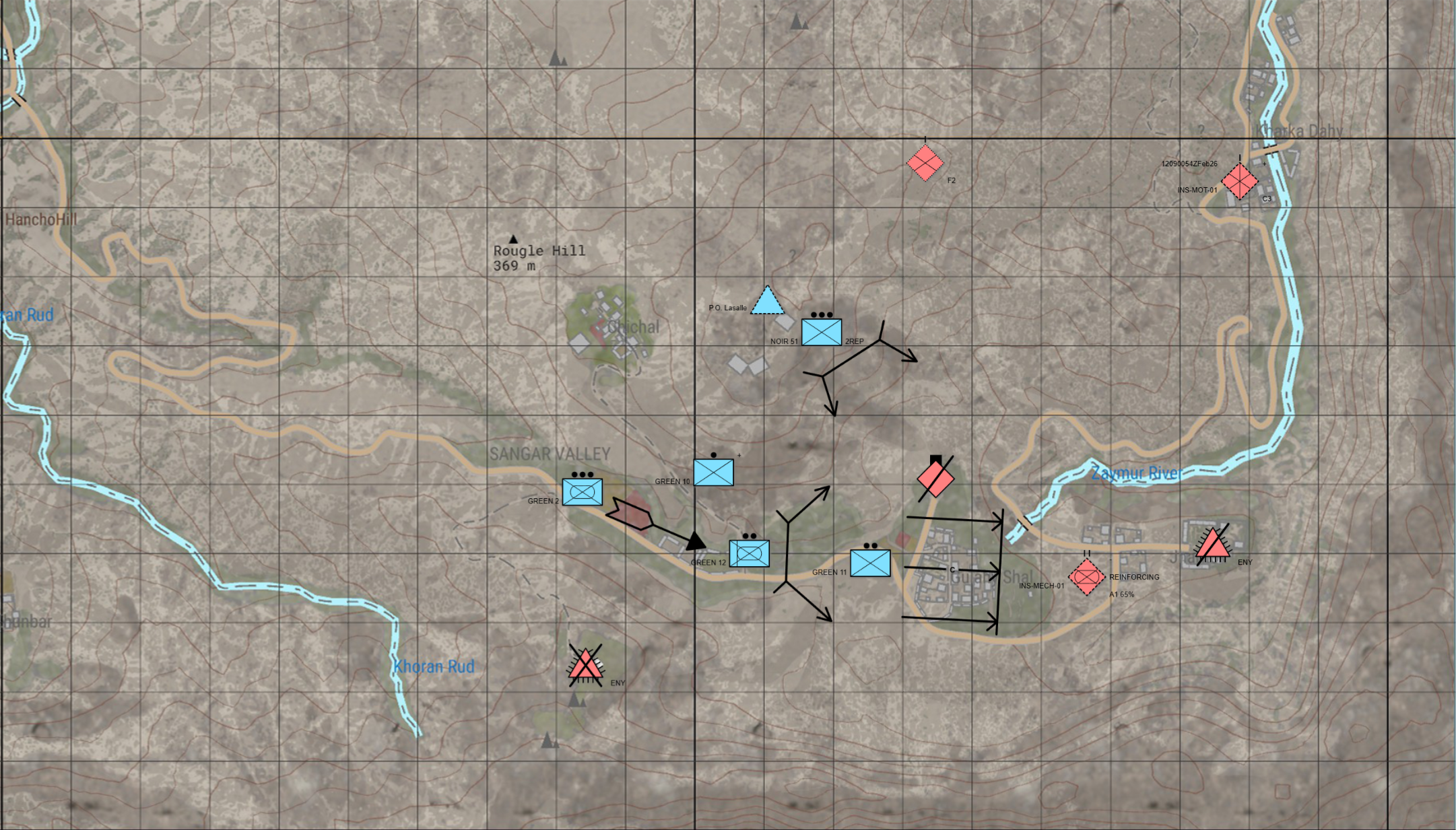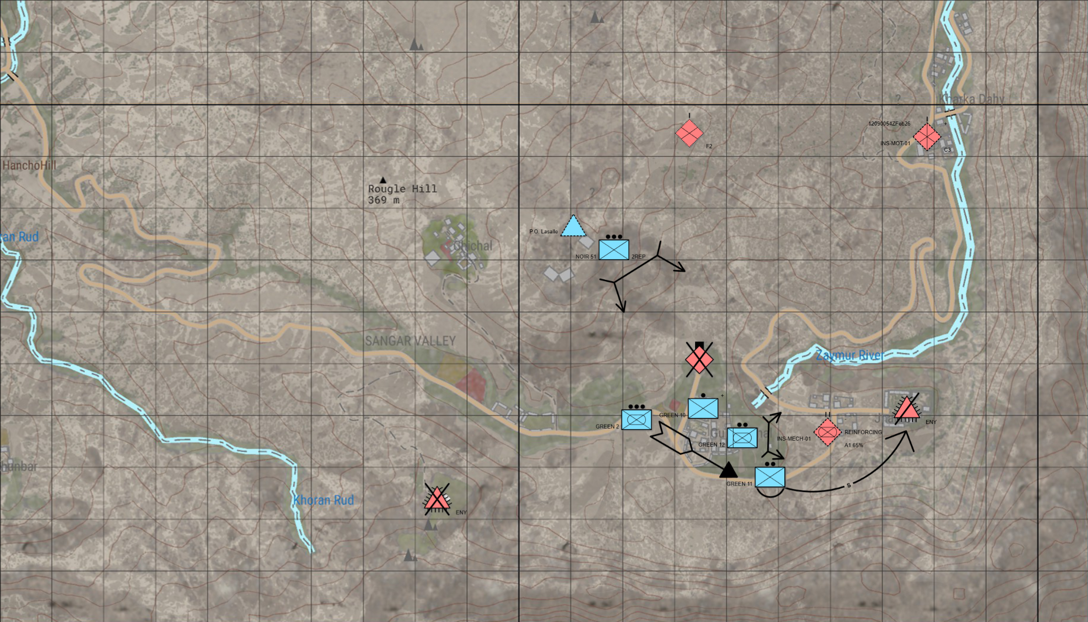 GTIA LÉGION elements are to CLEAR the town of GULAHY SHAL, DESTROY the enemy armor installation, and SEIZE the JHARNOK FOB in order to stabilize the Sangar Valley and block insurgent flow from the Northern Province.
