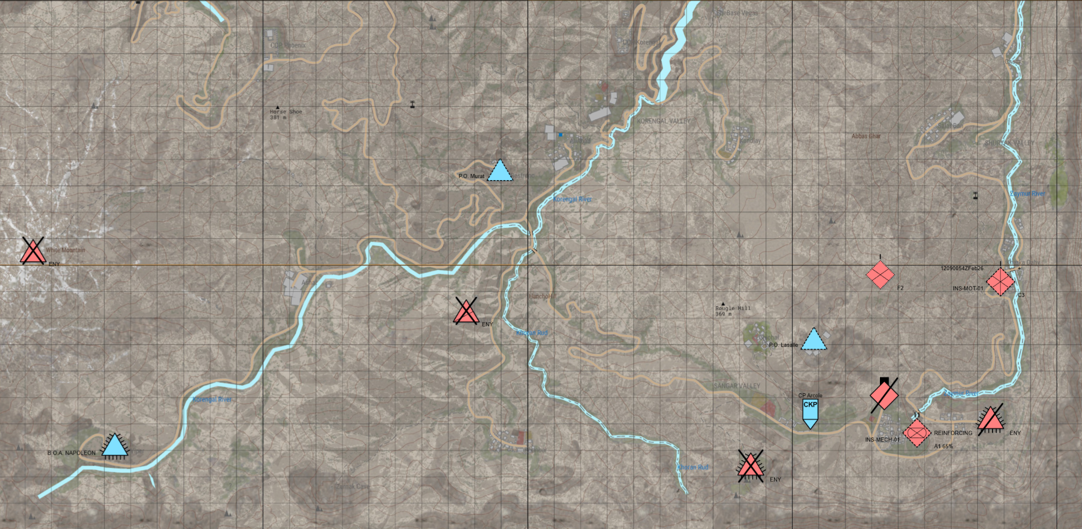 Following the establishment of CP ARCOLE (Grid 030003), GTIA forces maintain a foothold in the Sangar Valley. The "Castle" (028002) has been destroyed. However, the enemy maintains a strong mechanized presence in GULAHY SHAL and JHARNOK. Engineering Status: