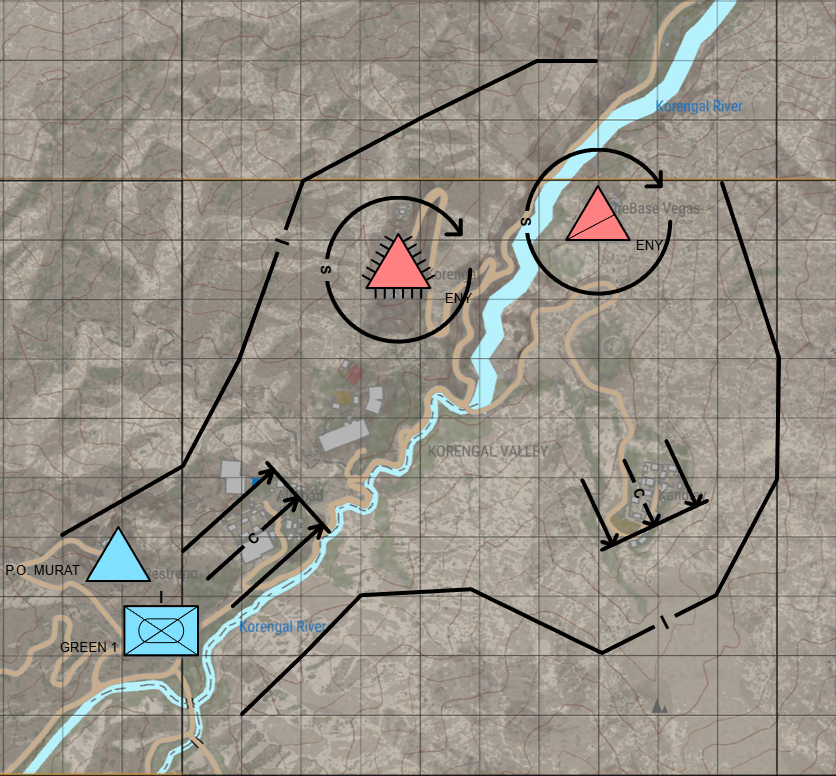 GREEN 1 and attached elements are to CLEAR the village of Khunbar and the adjacent cave complex in order to secure the Southern flank. BE PREPARED TO (BPT) transition to the North to SEIZE Ali Abad, COP Korangal, Kandlay, and Firebase Vegas to secure the entrance of the Korangal River Valley.